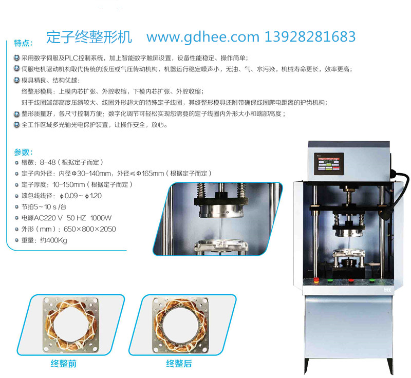 華源電機(jī)設(shè)備有限公司定子終整型機(jī)采用數(shù)字伺服及PLC控制系統(tǒng)智能控制,模具采用“上模內(nèi)芯擴(kuò)張、下模內(nèi)芯擴(kuò)張、外腔收縮”來按照工藝要求對(duì)內(nèi)外線圈的定子完美整型,使定子更加耐久,符合安全要求和美觀而設(shè)計(jì)??蓪?duì)0.10-----1.20mm嵌好的漆包線定子按工藝要求對(duì)內(nèi)外線圈進(jìn)行完美整型,輕易安裝轉(zhuǎn)子和端蓋。操作簡(jiǎn)單,性能穩(wěn)定,效率高;其優(yōu)勢(shì)在于:
