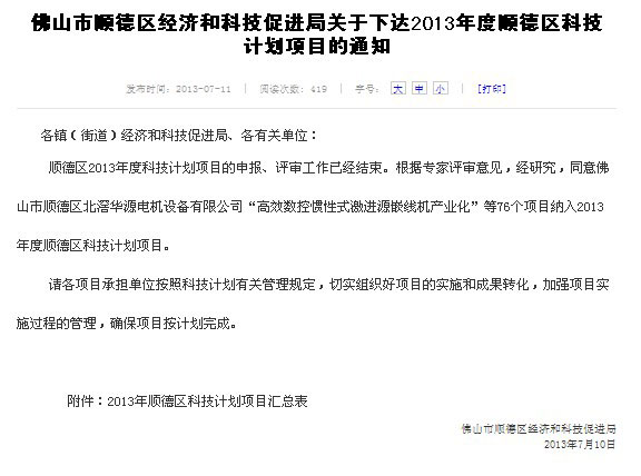 7月12號(hào),佛山市順德區(qū)北滘華源電機(jī)設(shè)備有限公司籠罩在一份濃濃的喜悅當(dāng)中,因?yàn)榻裉毂竟菊绞盏絹?lái)自佛山市順德區(qū)經(jīng)濟(jì)和科技促進(jìn)局關(guān)于下達(dá)2013年度順德區(qū)科技計(jì)劃項(xiàng)目的通知。順德區(qū)2013年度科技計(jì)劃項(xiàng)目的申報(bào)、評(píng)審工作已經(jīng)結(jié)束。根據(jù)專(zhuān)家評(píng)審意見(jiàn),經(jīng)研究,同意佛山市順德區(qū)北滘華源電機(jī)設(shè)備有限公司“高效數(shù)控慣性式激進(jìn)源嵌線機(jī)產(chǎn)業(yè)化”等76個(gè)項(xiàng)目納入2013年度順德區(qū)科技計(jì)劃項(xiàng)目。這個(gè)通知體現(xiàn)了國(guó)家和地區(qū)對(duì)本公司的關(guān)注和支持,極大的鼓舞了本公司的士氣,也為本公司的研發(fā)打下了物質(zhì)基礎(chǔ)。