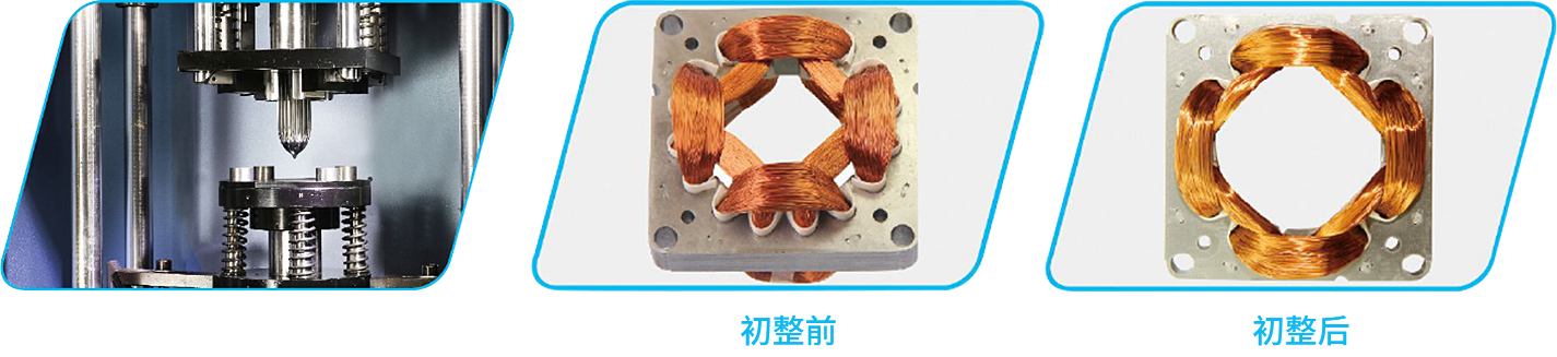 初整形模具:上模外腔收縮、下模內(nèi)芯擴(kuò)張、線圈上下端部高度可調(diào)(出線端向上),對(duì)于線圈端部高度壓縮較大的特殊定子線圈,其初整形模具還附帶確保線圈爬電距離的護(hù)齒機(jī)構(gòu);